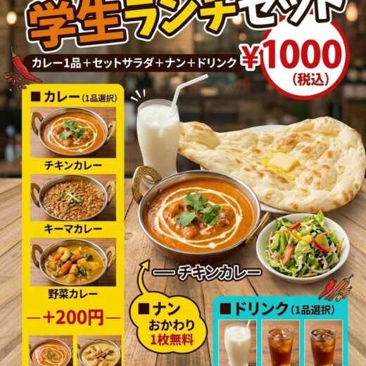 学生限定セットはじめました。カレー1品+ナン+ドリンク付きで ¥1,0...